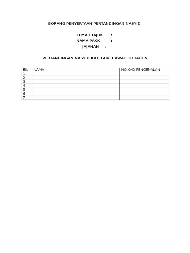 Contoh Borang Penyertaan Pertandingan Nasyid Dan Pidato Pdf