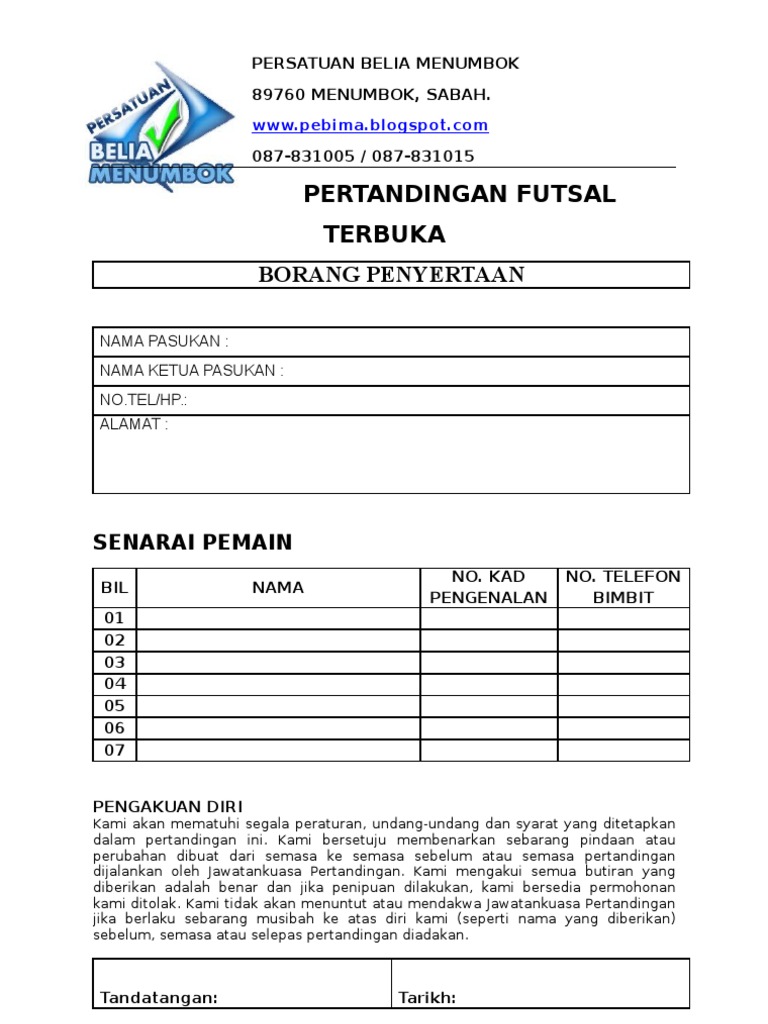 Contoh Borang Penyertaan Pertandingan Mewarna PUSPANITA DBP. Futsal adalah permainan 5 sebelah yang dimainkan secara dalaman di atas permukaan. Attribution Non-Commercial BY-NC Available Formats.