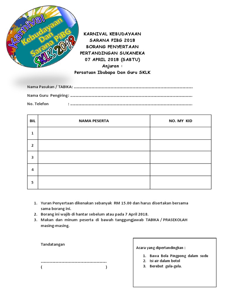 BORANG PENDAFTARAN DAN PENYERTAAN PERTANDINGAN MELUKIS DAN MEWARNA PENGAKUAN IBUBAPA ATAU PENJAGA MAKLUMAT PESERTA tanda P jika bukan ahli Saya telah membaca dan memahami syarat-syarat penyertaan yang disertakan bersama. Penyertaan akan ditutup apabila pihak Penganjur telah menerima sebanyak 20 penyertaan. Take the hassle out of athlete or sporter registration and sponsorships with an online sports form.