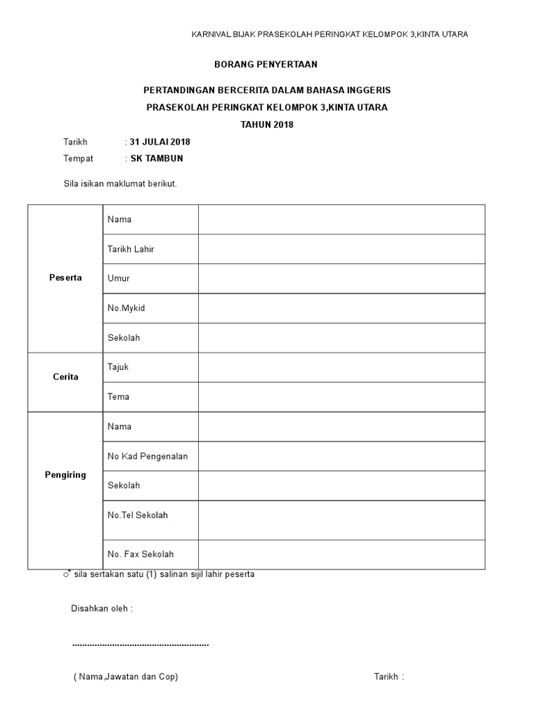 100 4 100 found this document useful 4 votes 10K views 2 pages. Contoh Borang penyertaan pertandingan menyanyi sekolah rendah. Jadi saya tulis di bahagian ini borang pendaftaran.